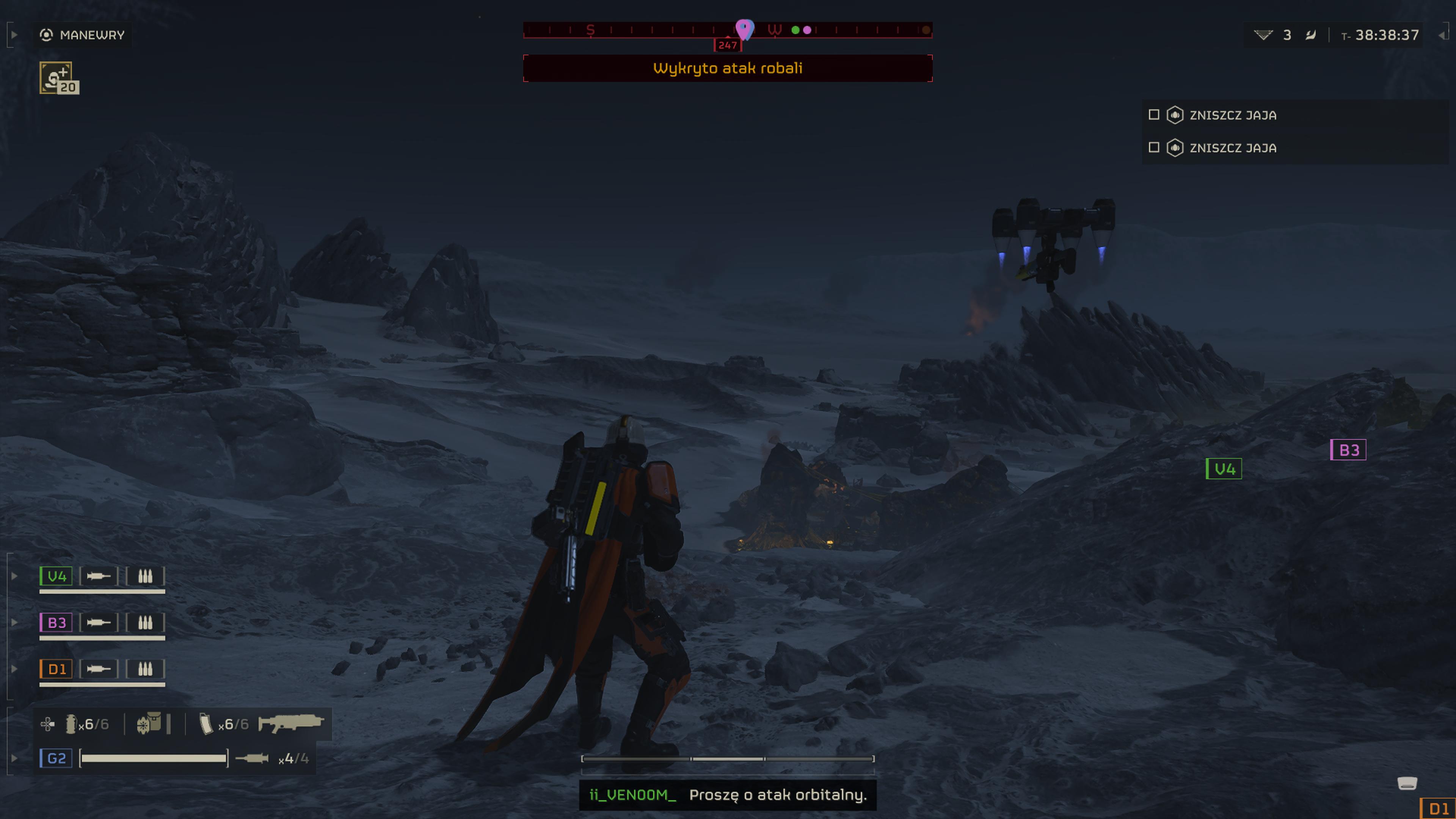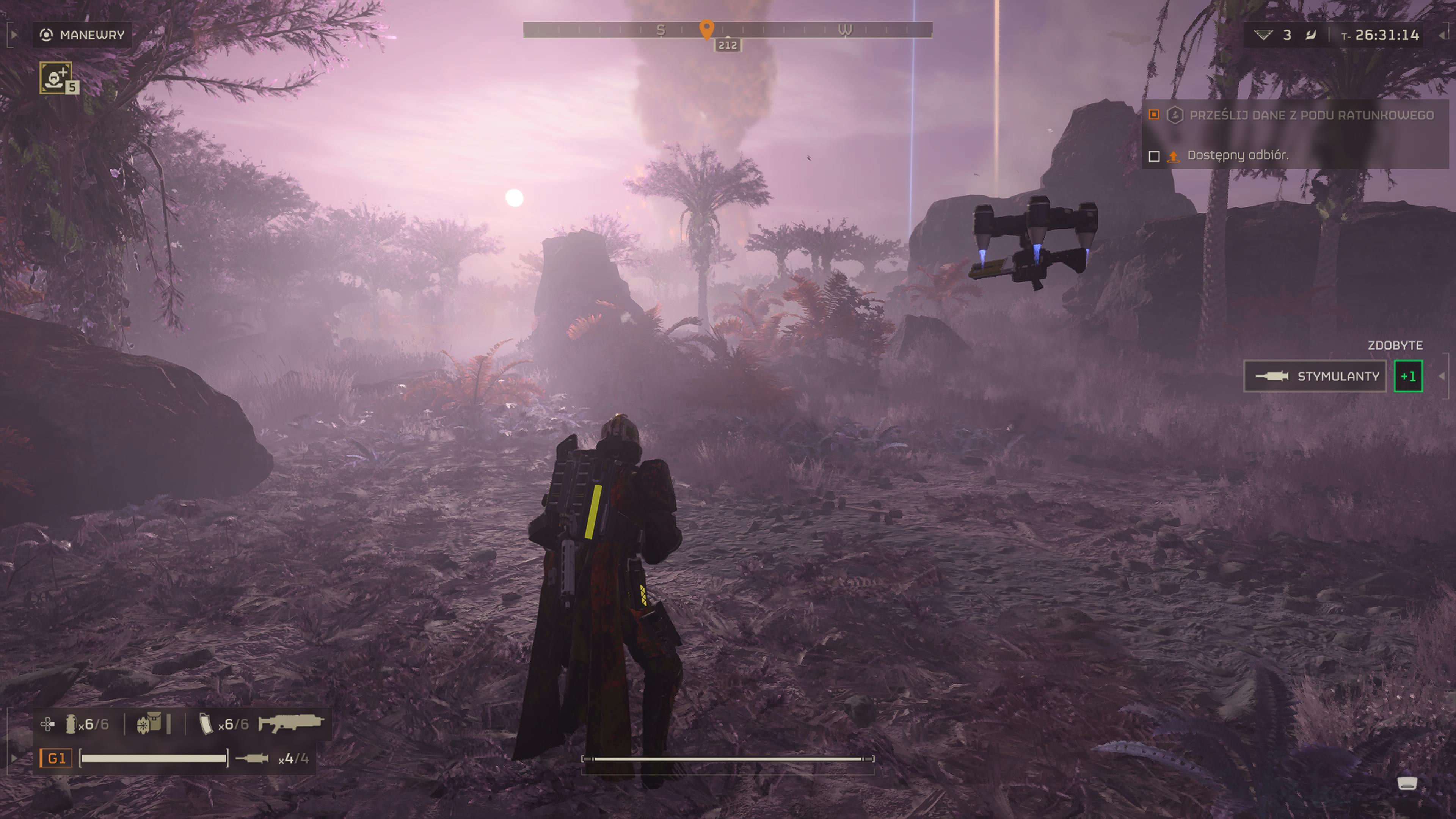 Zupełnie szczerze trudno mi odpowiedzieć na pytanie: co jest kluczem do sukcesu tej produkcji? Co tylko potęgowane jest świadomością, że formuła gry praktycznie nie zmieniła się względem tego, co jedynka pokazywała na PlayStation Vita (później i PS4). Oczywiście znalazło się w grze kilka istotnych nowości jak możliwość przejścia w tryb pierwszej osoby przy strzelaniu, czy odbieranie obrażeń w różne części ciała. Wyróżniającymi elementami rozgrywki Helldivers 2 są niewątpliwie liczne rodzaje wsparcia, jakie możemy przywołać w trakcie starć i forma ich przywołania. Od dodatkowej broni, po plecaki z amunicją czy mobilne generatory tarczy ochronnej. Wiele rodzajów wieżyczek oraz jeszcze więcej form wsparcia z powietrza. Od nalotów dywanowych, po zrzut napalmu, czy potężnego, pięciusetkilogramowego ładunku wybuchowego. Do przywołania każdego musimy wprowadzić odpowiednią kombinację przycisków kierunkowych, co nadaje tej czynności zręczności, która w chwilach stresu np. ucieczka przed hordą robali, tworzy historie zostające z nami na długo po odłożeniu pada. Zresztą to nie jedyne miejsce, gdzie przyjdzie nam bawić się we wprowadzanie szyfrów kierunkowych. Misje na planetach to nie tylko szerzenie dostępu do wolności słowa oraz demokracji wiadrami pocisków, ale także prace do wykonania. Podłożenie bomby i wysadzenie wieży komunikacyjnej. Odzyskanie surowców z przejętego przez wroga obszaru. Umożliwienie ucieczki promem kosmicznymi cywilom z bazy wojskowej. Wystrzelenie rakiety o ładunku atomowym oraz wiele innych. Zdarzy się, że będziemy musieli nosić ciężkie pociski do artylerii, rozrzucone na obszarze pociskami, czy wykonać inne manualne mechaniki, a dopiero potem wklepać kombinacje kierunków, aby uruchomić działo ziemia-powietrze, dla przykładu. To zdecydowanie bardzo potrzebne urozmaicenie rozgrywki, które przeplata się z nieustannym strzelaniem do wrogów i generuje niezapomniane scenariusze. Wymagająca od nas wzajemnego ubezpieczania się z kompanami, ochrony własnej skóry i wykonywania mozolnych czynności.