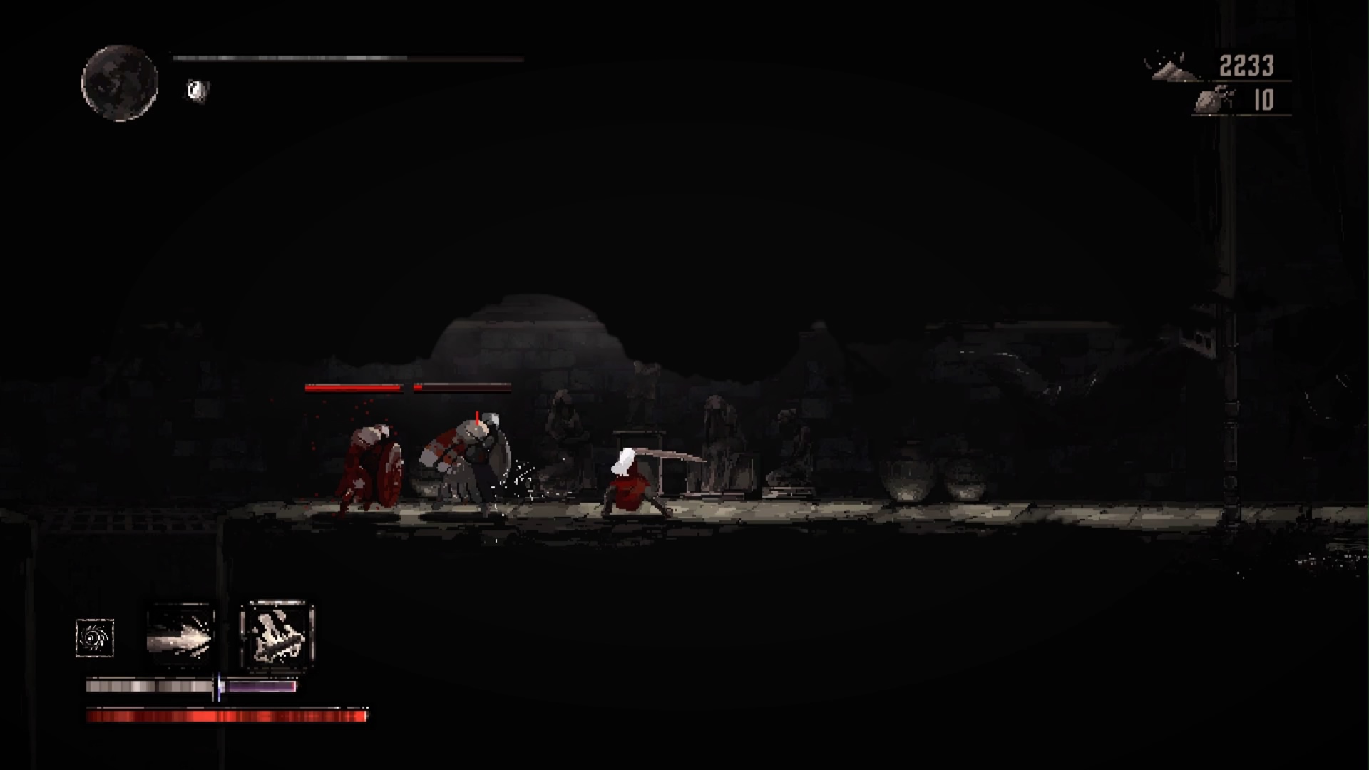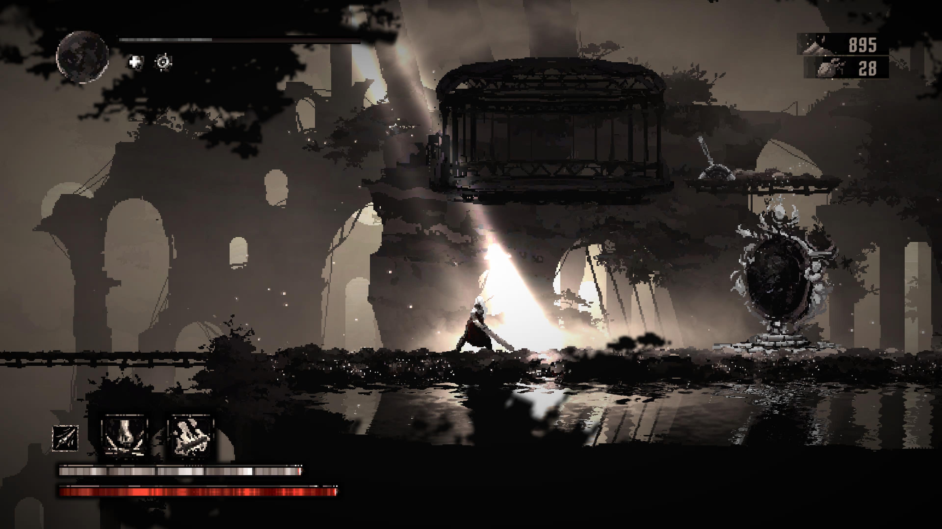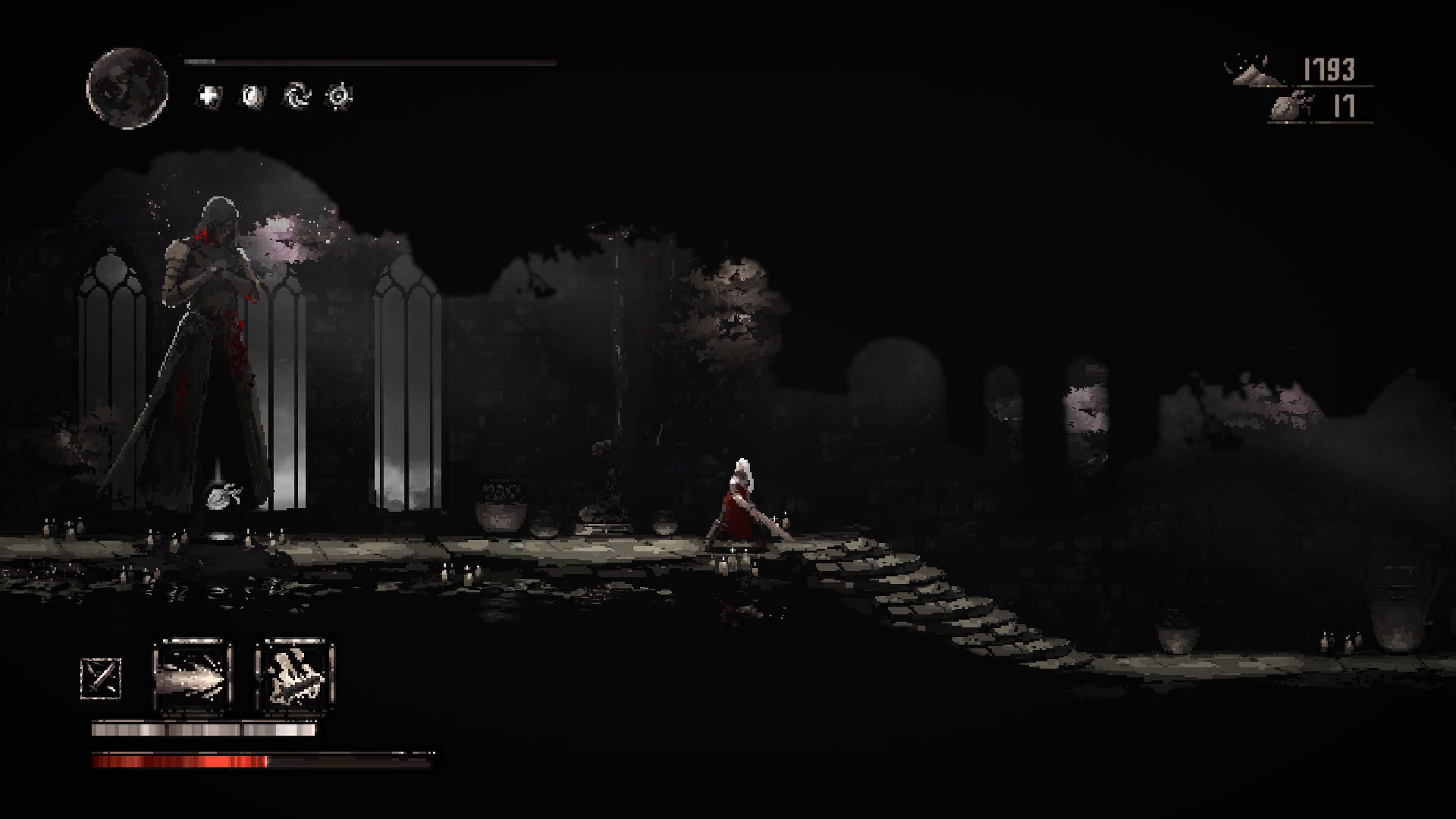 Z wywiadu, jaki przeczytałem na Push Square, twórcy mówili bardzo dużo na temat Dark Souls i wpływie, jaki na ich pracę miały gry From Software. W grze jest to odczuwalne pod wieloma względami, jak np. od storny grafiki po muzykę. Pierwszymi z nich są atmosfera i ton, jaki wybrzmiewa z całej gry. Momentalnie uderza w nas chłód, jakim dmucha wszystko w Moonscars. Kolorystyka gry jest utrzymana w odcieniach szarości, ze sporadycznymi przebarwieniami brudnego złota i czerwonymi akcentami, zdobiącymi model naszej bohaterki i przeciwników. Biel natomiast to kolor czarów, których używamy. Twórcy we wspomnianym wywiadzie mówili o inspiracji dziełami Rembrandt, co spina się z grafiką gry. Cała gra jest w pixel-artcie. Zarówno rozgrywka, scenki przerywnikowe, jak i interfejs, i wszystko trzyma się zimnej tonacji barw i minimalistycznego designu. Nie mniej, gra jest ładnie wykonana. Animacje ataków i czarów cieszą oko fana stylu pikselowego. Oczywiście, tak „smutny” klimat nie jest dla każdego, aczkolwiek jeśli mało wam chłodu w listopadowe wieczorki, to…przykręćcie kaloryfery, a z oszczędności kupcie Moonscars.