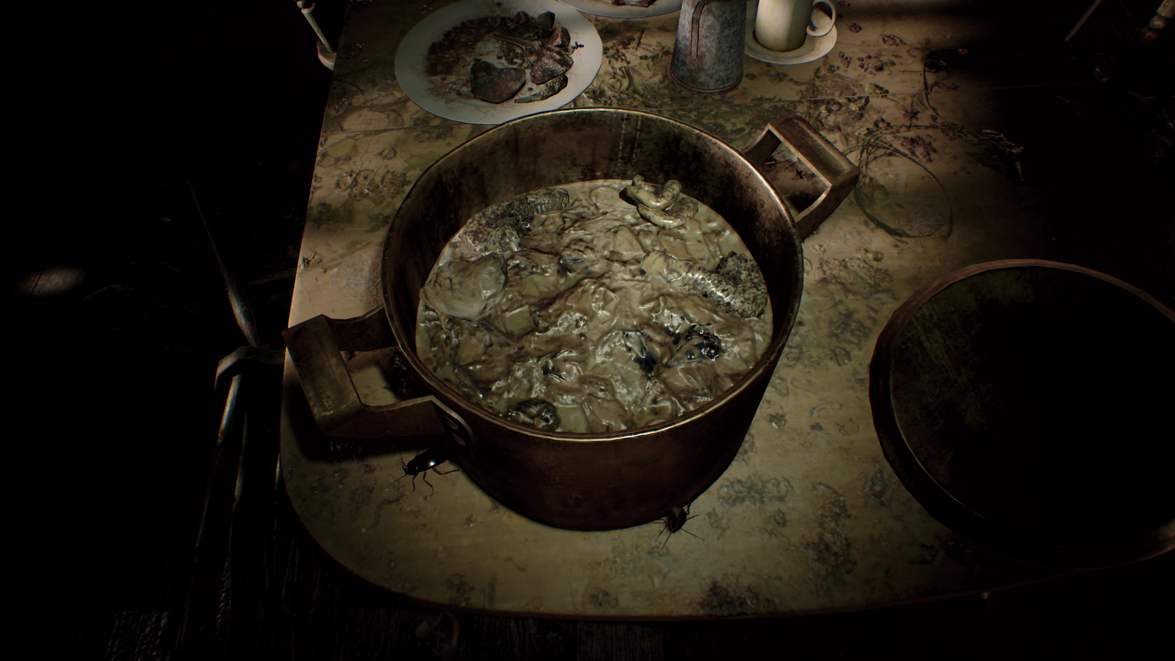 Wyposażenie w latarkę, nieświadomi czekającego nas zagrożenia (bo nie wiemy, co i kiedy wyskoczy) ruszamy do kuchni, gdzie już można zauważyć zmiany w warstwie narracji wizualnej. Gra jest bardzo w tym zakresie wulgarna, pierwotna i obrzydliwa. Widać i słychać muchy, stół przedstawia zepsute, przegniłe i śmierdzące jedzenie. Da się wyczuć odór otaczającego nas rozkładu. I to jest dopiero początek.