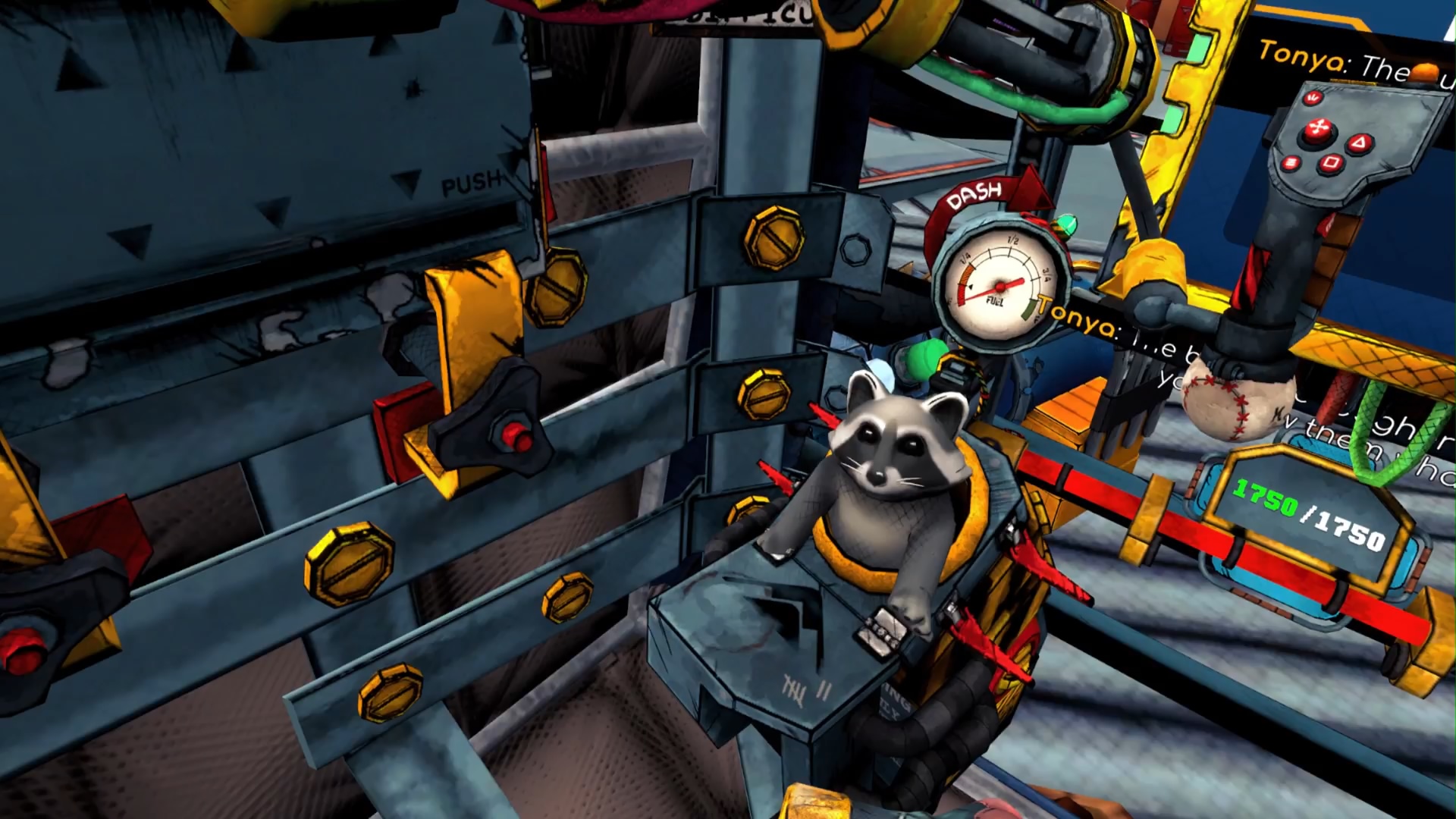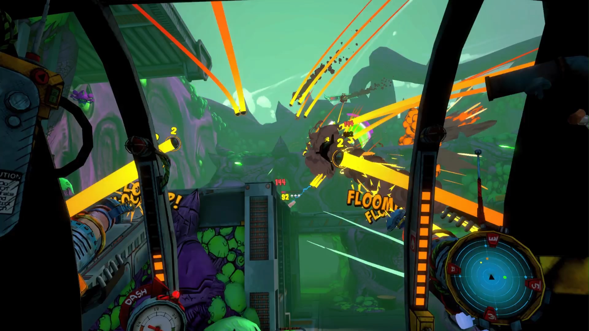 Ustawienie stylu obracania kamery to wajcha po naszej lewej. Kontrola wbudowanego chata audio to przyciski po prawej stronie. Natomiast umiejętność specjalną mecha ładujemy niczym pocisk w czołgu, chwytając za kanister z podajnika i wsuwając go do tuby przed nami. Wrażenia z siedzenia w mechu są fantastyczne. Big Shots sprostało idealnie moim wyobrażeniom tego, jak mogłaby wyglądać zabawa w pilota mecha, w VR. W belgijskiej ekipie, która odpowiedzialna jest za tytuł, musiał być ktoś naprawdę zajarany wielkimi robotami. Ze sterowania problem początkowo sprawiało mi jedynie unoszenie się mecha w powietrzu, które kontynuując budowę gry, wykonujemy poprzez puszczenie jednego z drążków sterowniczych i pociągnięcie za uchwyt pomiędzy nogami. Było to jednak spowodowane złym usadowieniem się do rozgrywki. W Big Shots, albowiem gra się na siedząco i może się okazać, że przez uchylanie się, uchwyt latania będzie byt blisko naszego ciała. Przy dobrym usadowieniu się, gra to majstersztyk. Spełnienie marzeń fanów mechów.