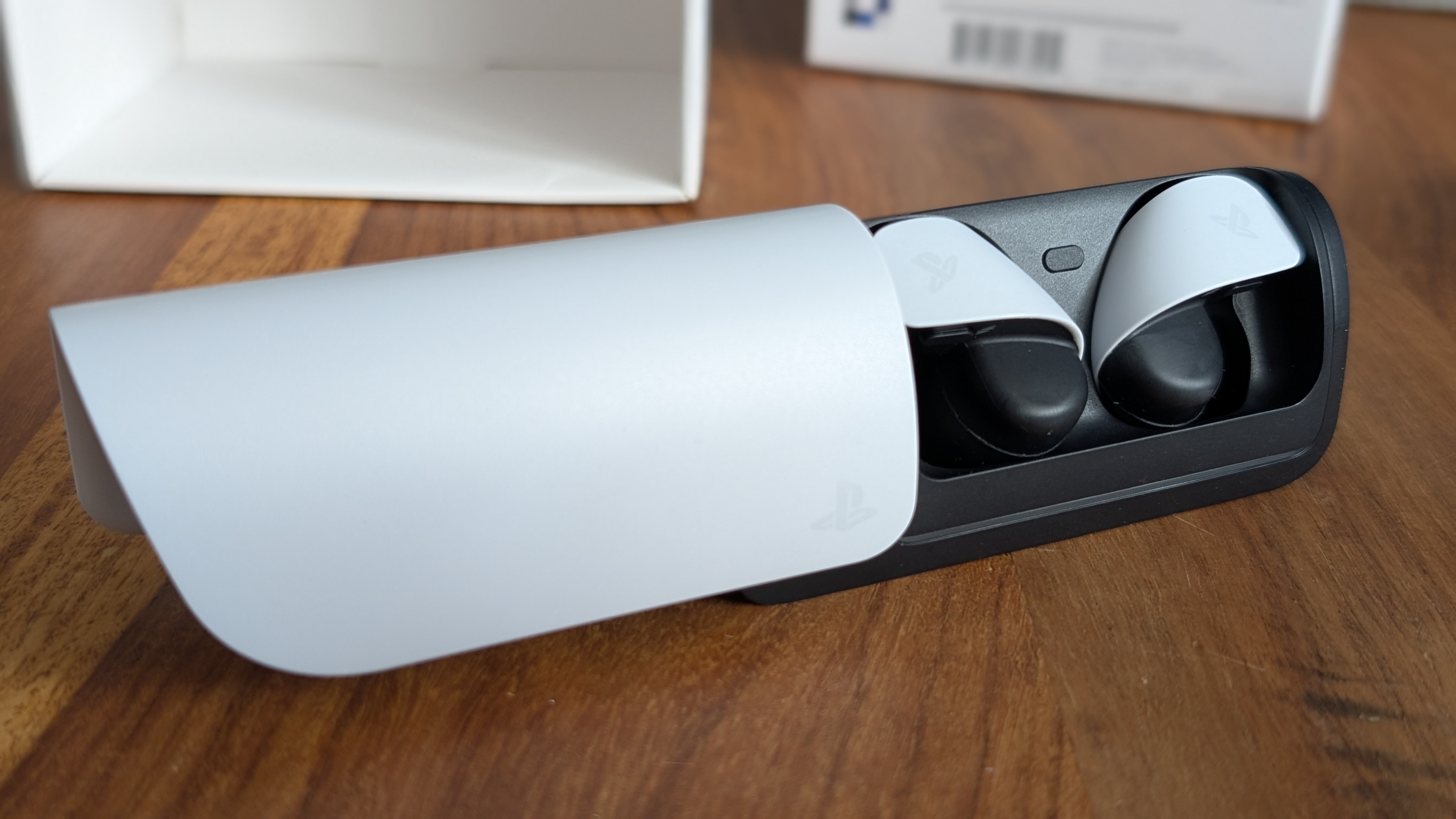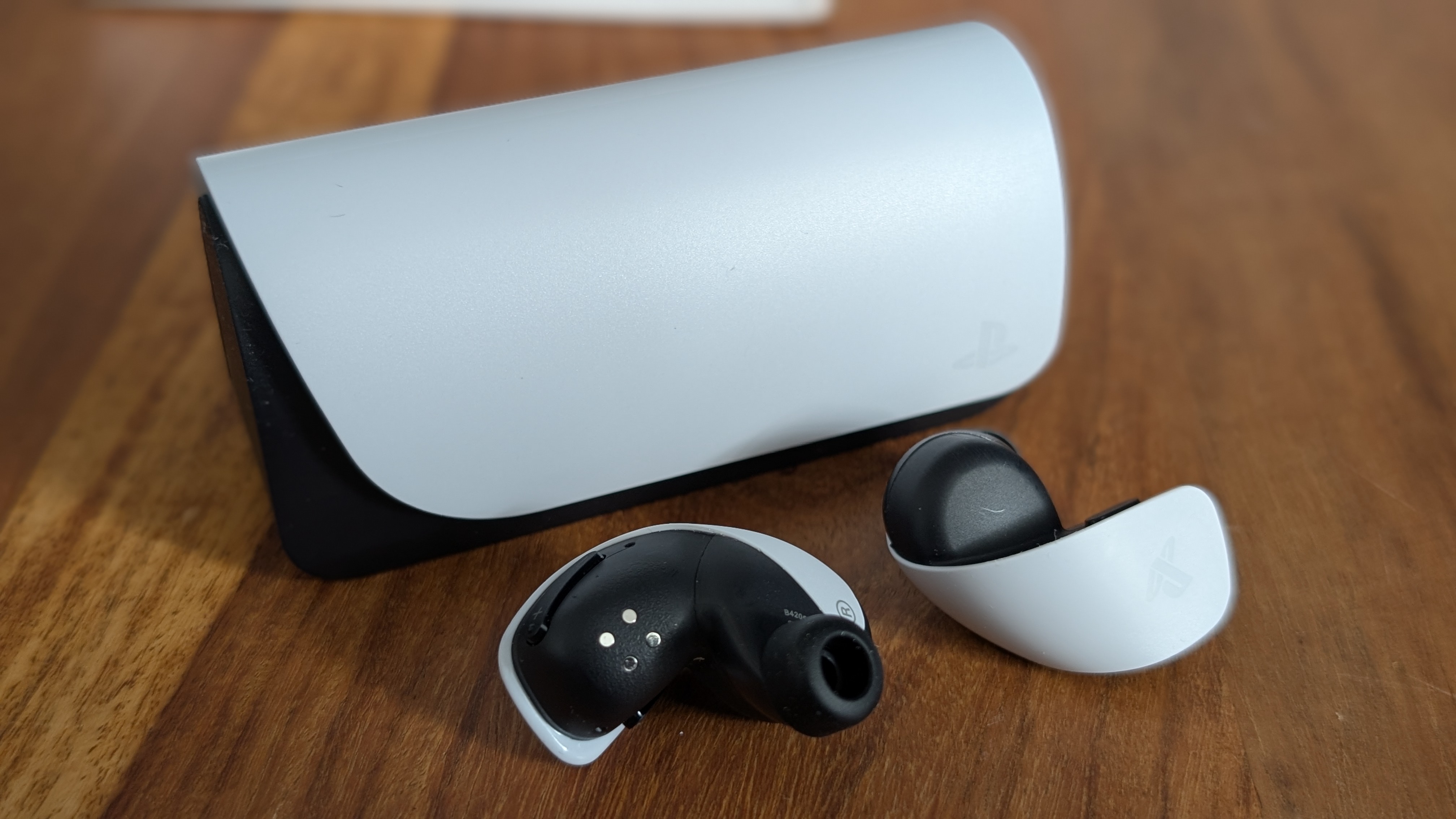 W opakowaniu ze słuchawkami otrzymujemy futerał/pokrowiec, który jest zarazem stacją ładującą. Dla mnie to nowość, bo korzystam tylko ze słuchawek nausznych, więc dla każdego fana earbudsów wszelkiej maści pewnie nie będzie to zaskoczeniem. Kabel USB-A na USB-C do ładowania, trzy komplety gumek do uszu oraz adapter PlayStation Link, dla sprzętów, które nie korzystają z tego systemu komunikacji – czyli wszystko poza Portalem. Z początku byłem zdziwiony, że PlayStation Link nie ma interfejsu USB-C, jednak patrząc z perspektywy kompatybilności ze sprzętem wszelkiej maści, jak i tego, że moje PS5 Pro ma z tyłu dwa porty USB-A i chciałbym go schować właśnie tam, co nabrało sensu. Wizualnie słuchawki mają fajny kształt, podobają mi się w uszach znacznie bardziej niż te od firmy z nadgryzionym jabłuszkiem, które wyglądają jak moje stare słuchawki z walkmana w podstawówce, z odciętym przewodem. Na górze słuchawek znajduje się sterowanie głośnością, a na spodzie przycisk parowania PS Link. Fakt, że pełne sterowanie znajduje się na obu słuchawkach, jest super, ponieważ można korzystać tylko z jednej słuchawki bez uszczerbku dla funkcji.