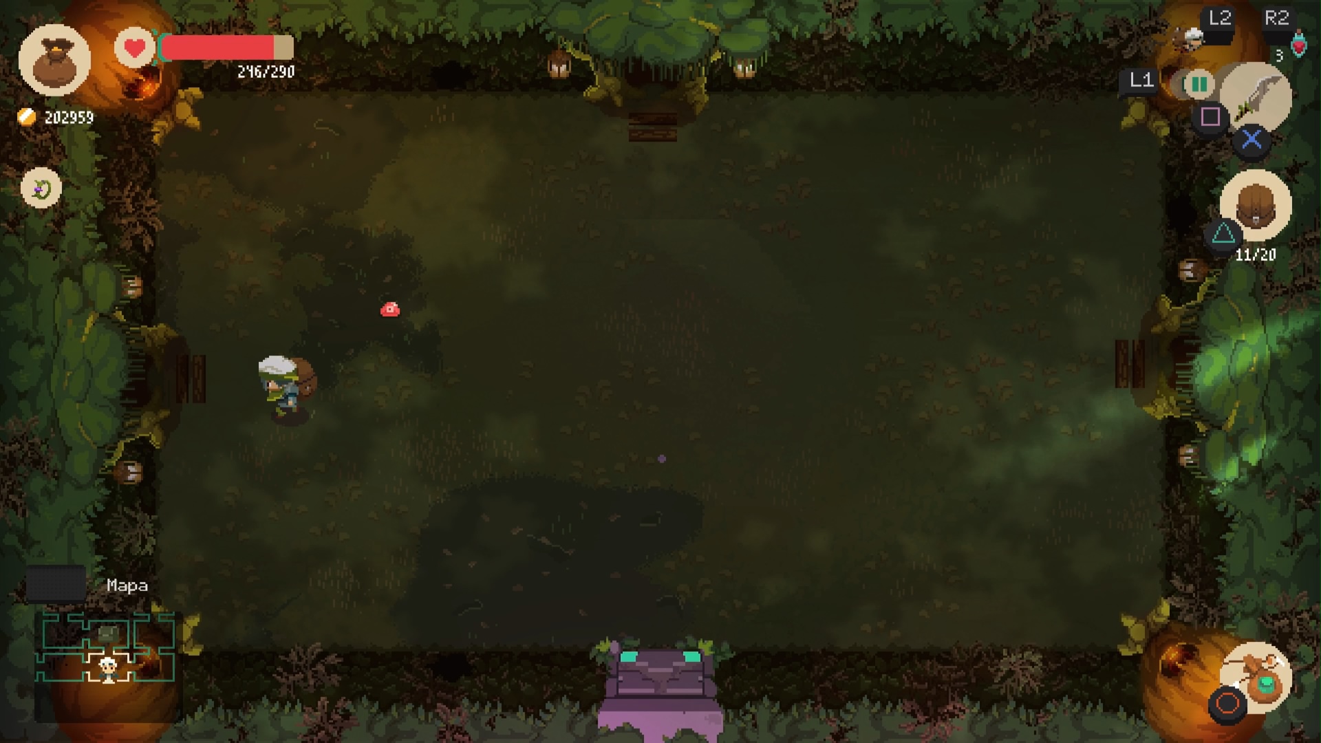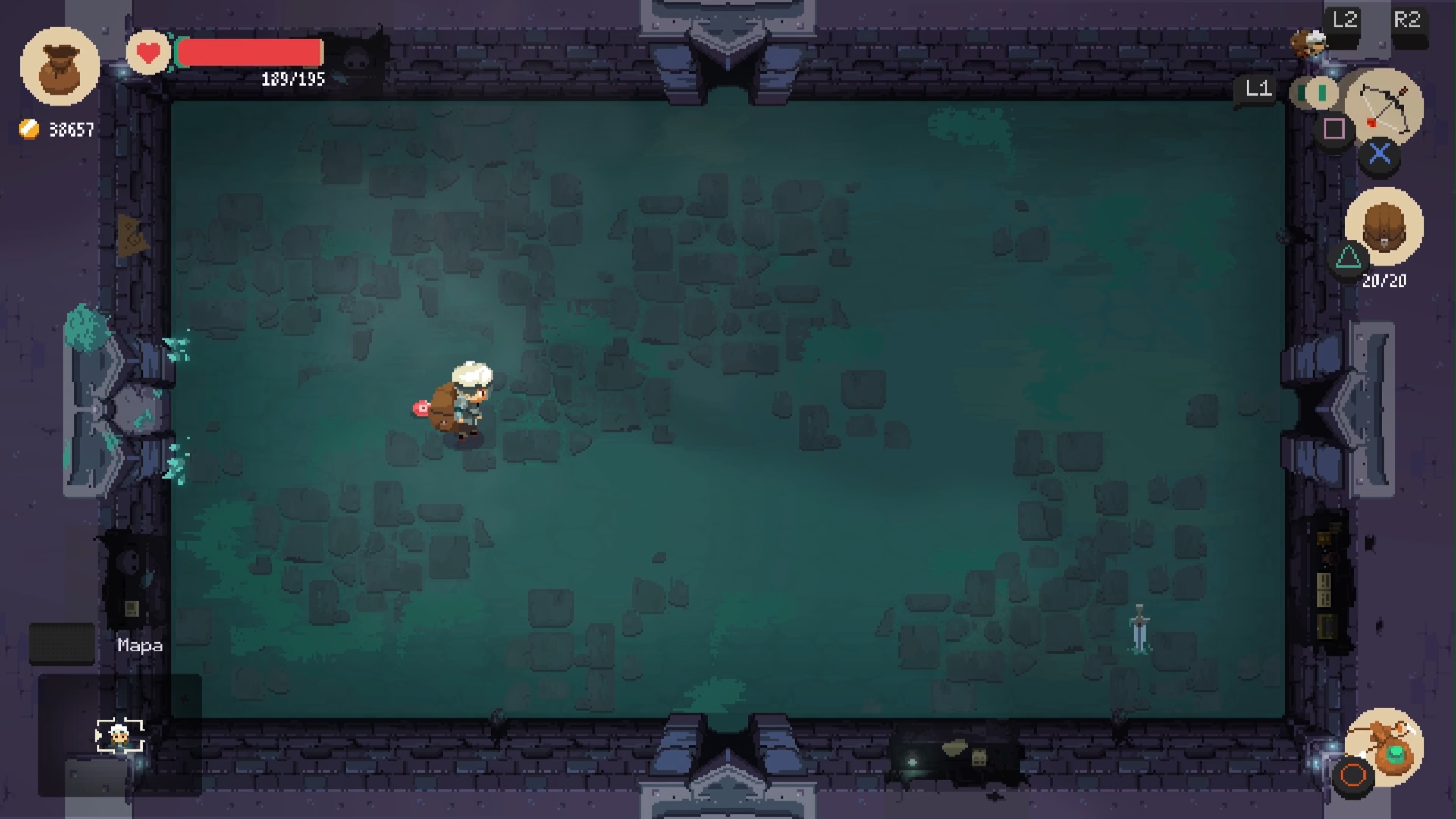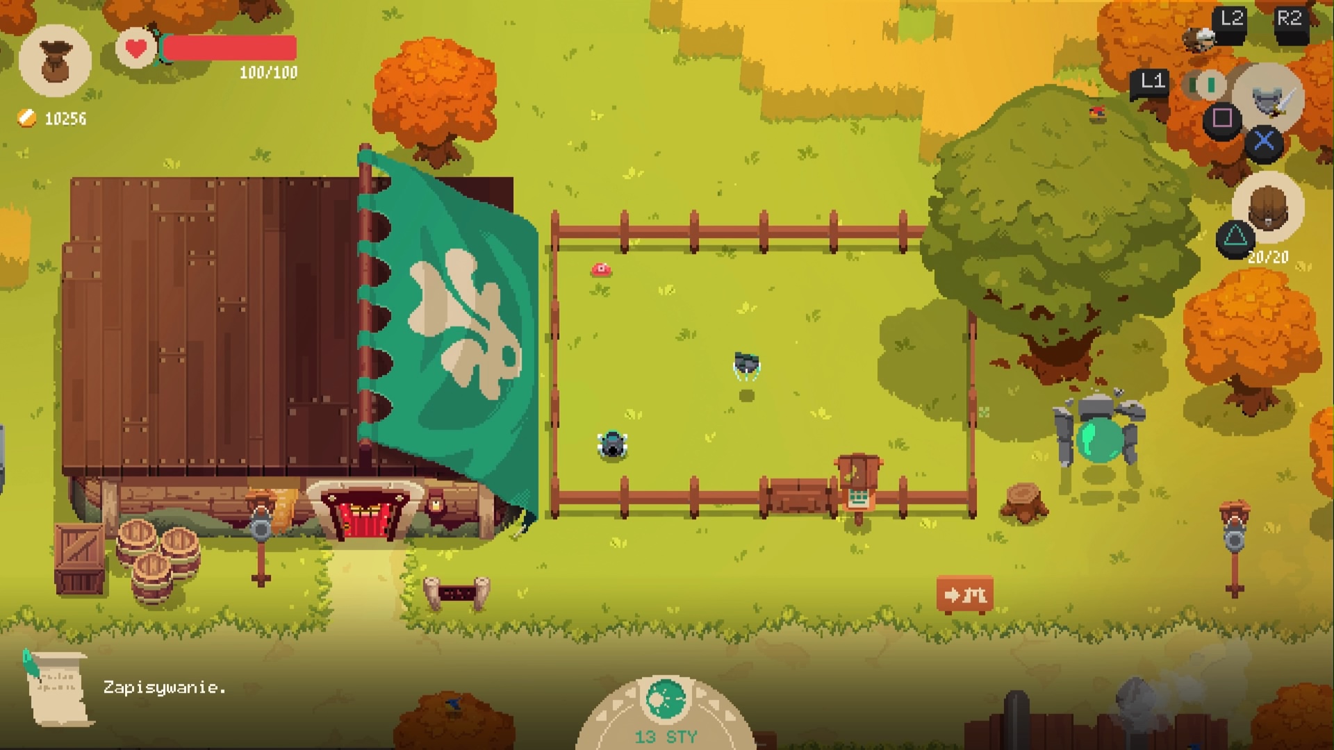 W ten sposób dochodzimy do wyżej wymienionych dwóch form zabawy, jaką zapewnia nam ten indyk. W nocy (nie tylko) Will wyrusza do lochów w poszukiwaniu skarbów. Tutaj rozgrywka przypomina mi klasyczne odsłony serii Zelda czy The Binding of Isaac. Lochy składają się z losowo generowanych pomieszczeń, losowanych z szerokiej puli szablonów. Trochę nam zajmie, zanim zaczniemy kojarzyć znajome ułożenie przeciwników, przepaści i elementów otoczenia. Kamera zawieszona jest niemalże równolegle do podłoża, ale z lekkim kątem, co bardzo przypominało mi właśnie Isaaca, czy Link’s Awakening z Game Boya: zawsze w kształcie prostokąta, kamera nieruchomo, całe pomieszczenie wypełnia ekran telewizora. Struktura poziomów to kwadraty, więc wszystko, co na levelach się znajduje, ma kształt możliwy do odwzorowania poprzez kwadraty. Poruszanie się po nich również mocno przypomina mi starą szkołę rogalików, ponieważ mimo możliwości poruszania się we wszystkich kierunkach, wyraźnie sterowanie ma naturę skierowaną pod krzyżaka na padzie.